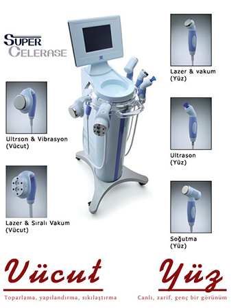 Super Celerase biomedikal bir cihaz olup gerçek bir Japon harikasıdır. Cihaz kendi işlevlerinde hiçbir sarf gerektirmemekle beraber, konfigrasyonunda Ultrason & Vibrasyon ( vücut ) – Soft Lazer & Sıralı Vakum ( vücut ) – Lazer & Vakum ( Yüz ve Dekolte ) – Ultrason ( Yüz ) – Cooling ( Tüm vücut ve Yüz Soğutma ) problarını taşımaktadır. Her seansta birbirini takip eden bu çalışmalar selülit başta olmak üzere vücutta fark edilir bir incelme, bölgesel incelme, cildin toparlanması ve sıkılaşması ile diri ve genç bir görünüme olanak verir. Güvenirliği kanıtlanmış olan bu üstün teknoloji ürünü cihaz, 1 MHz ultrason gücüne sahip ve 808 nm diot soft lazer ile vakum ve vibrasyonla eş zamanlı ve değişken çalışma olanağı tanır